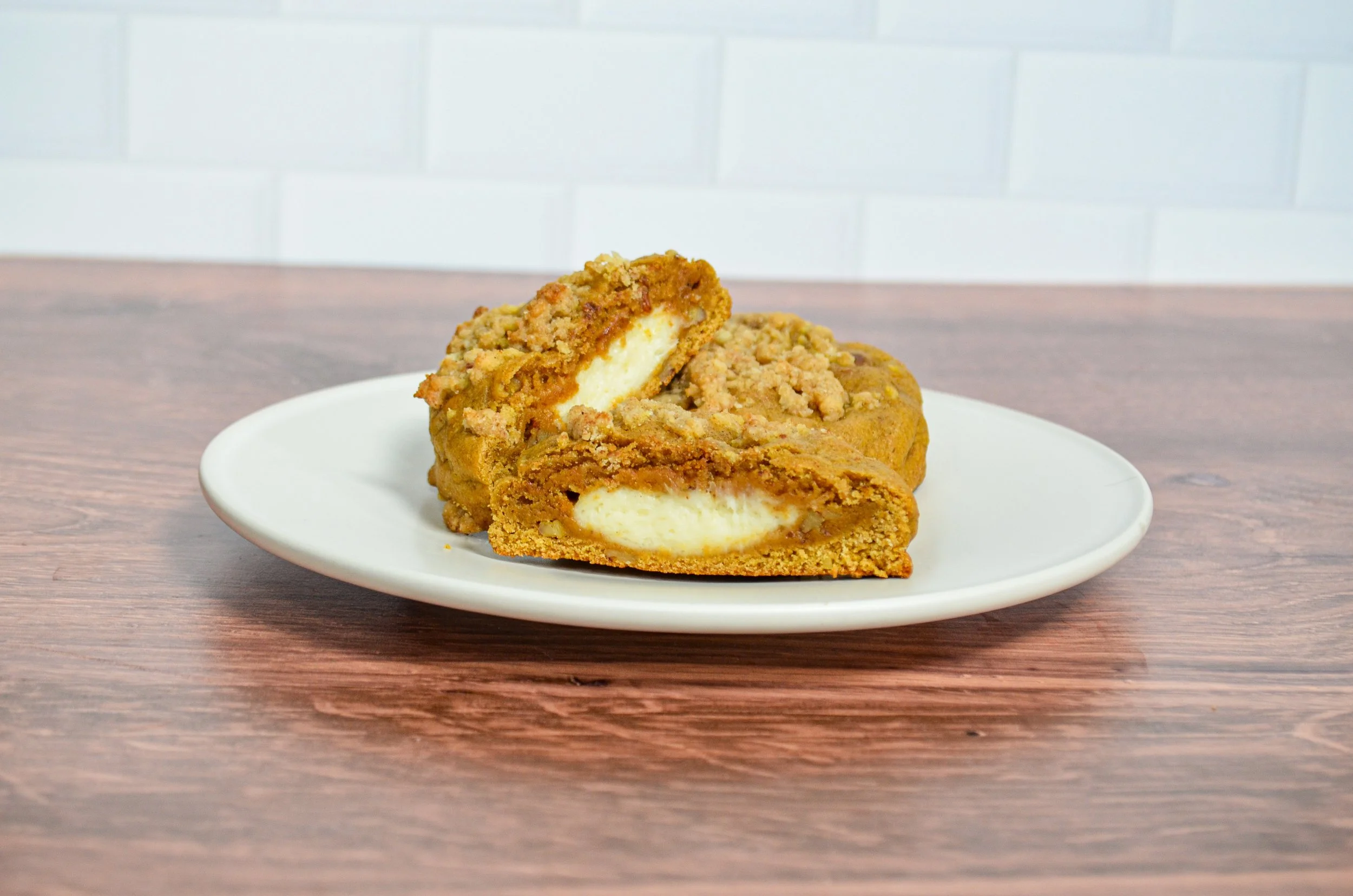 Seasonal • Pumpkin Pecan Cheesecake Cookie Gourmet CookiesSeasonal Oct 13 Written By Beth Modder A fall dessert wrapped up in one decadent cookie. With warm pumpkin spice, roasted pecans, house-made gingersnaps, creamy cheesecake filling, and a spiced crumble topping, this cookie captures the essence of autumn in every bite. Beth Modder